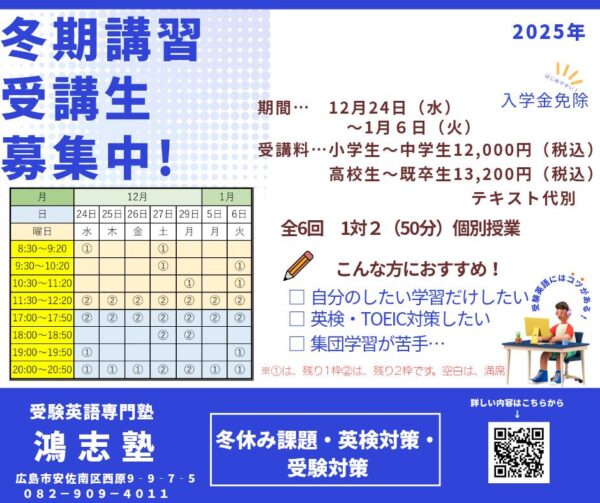 広島市安佐南区の英語専門塾「鴻志塾」では、2025年冬期講習の受講生を募集しております!