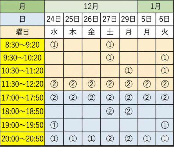 開講日:12/24(水)・25(木)・26(金)・27(土)・29(月)・1/5(月)・6(火)